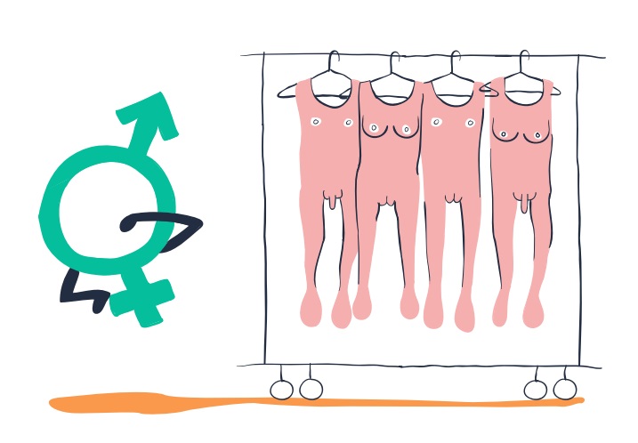 Otra de las imágenes más llamativas es la de un armario donde se sitúan trajes colgados que simulan cuerpos para poder elegir aquel con el que cada persona se sienta más identificada y, al igual que se hace con la ropa, ponérselo y quitárselo con total naturalidad, como si el sexo se tratara de una elección.