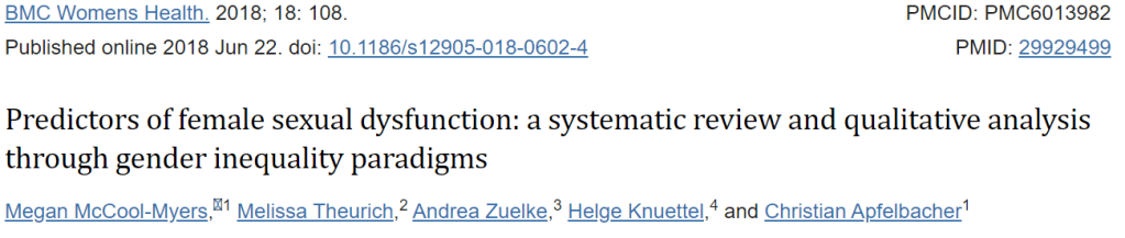 «La disfunción sexual femenina afecta al 41% de las mujeres en edad reproductiva de todo el mundo, lo que la convierte en un problema médico de alta prevalencia [1]. Según el Manual Diagnóstico y Estadístico de los Trastornos Mentales (5.ª edición, 2013), la disfunción sexual femenina comprende los siguientes trastornos: trastorno del interés/excitación sexual, trastorno orgásmico femenino y trastorno genitopélvico/dolor/penetración [2].»